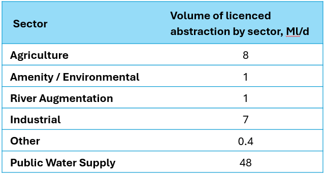 Data has been calculated from the National Framework data provided to water companies, this has been used to calculate the volumes of abstraction for all sectors in the Severn Uplands catchment, these numbers are just for groundwater abstraction and include abstractions outside of the area of interest for example for Public Water Supply in Wales by Dwr Cymru Welsh Water and Hafren Dyfrdwy: