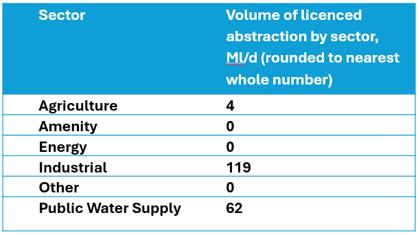 In this area, Severn Trent has four operational abstraction licences authorising 14Ml/d of abstraction from groundwater. United Utilities also has a number of groundwater and surface water abstractions in the catchment.